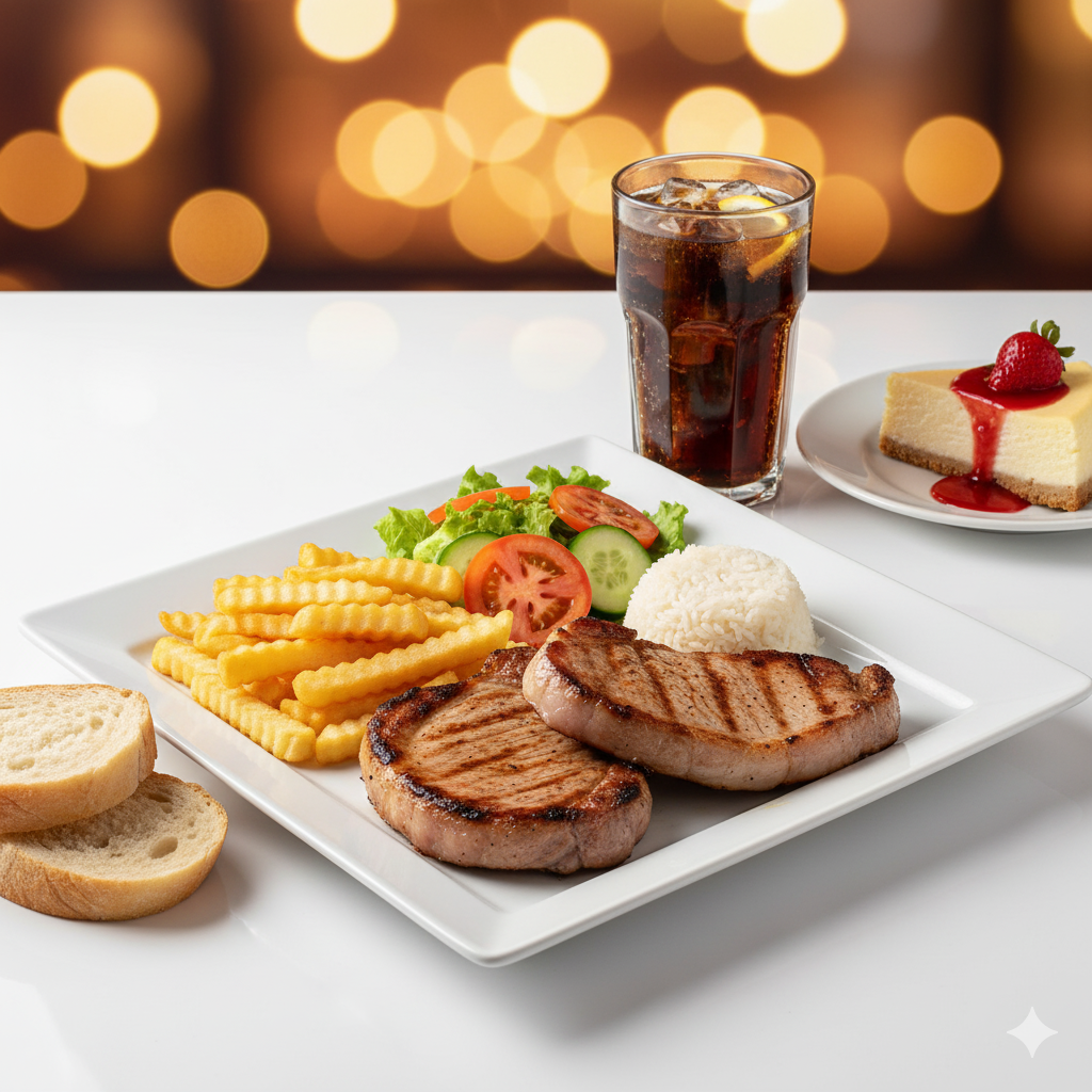 El menú completo es la opción ideal para quienes buscan una comida sustanciosa y sin preocupaciones. Este menú te ofrece una experiencia culinaria completa y conveniente, con una selección de los principales platos de la carta (lomo, pollo o hamburguesa) y un segundo plato. Además, incluye una bebida, pan, y a elegir, un postre delicioso o un café para terminar. Es una opción muy versátil y de gran valor, pensada para que disfrutes de una comida de calidad sin tener que elegir cada elemento por separado. Es perfecto para un almuerzo o cena que te deje totalmente satisfecho.