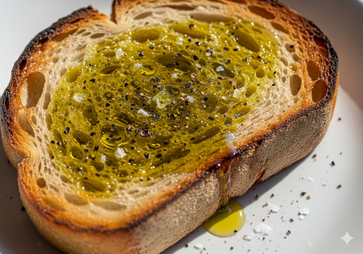Un desayuno tradicional y saludable con pan tostado y un generoso chorro de aceite de oliva virgen extra.